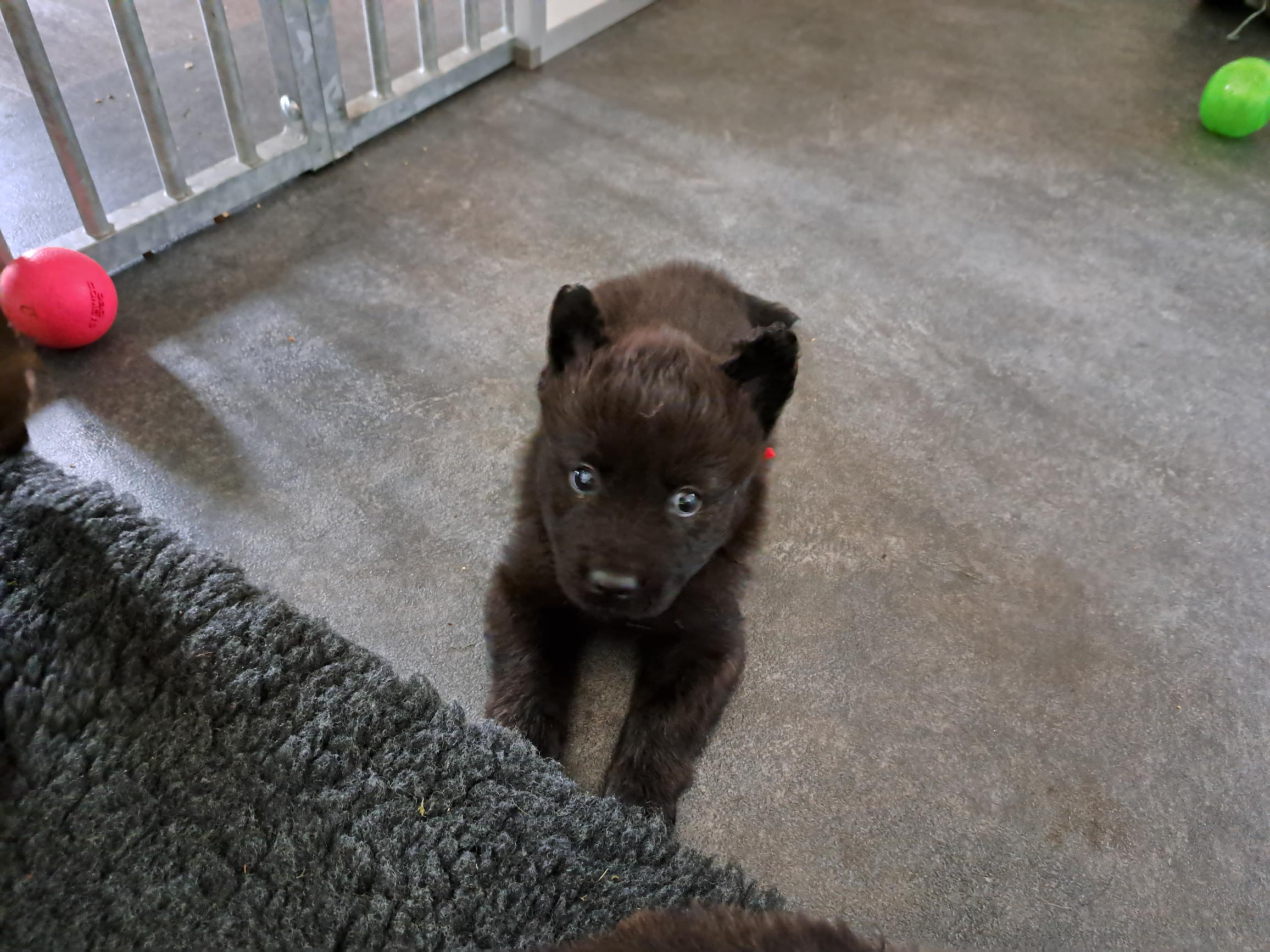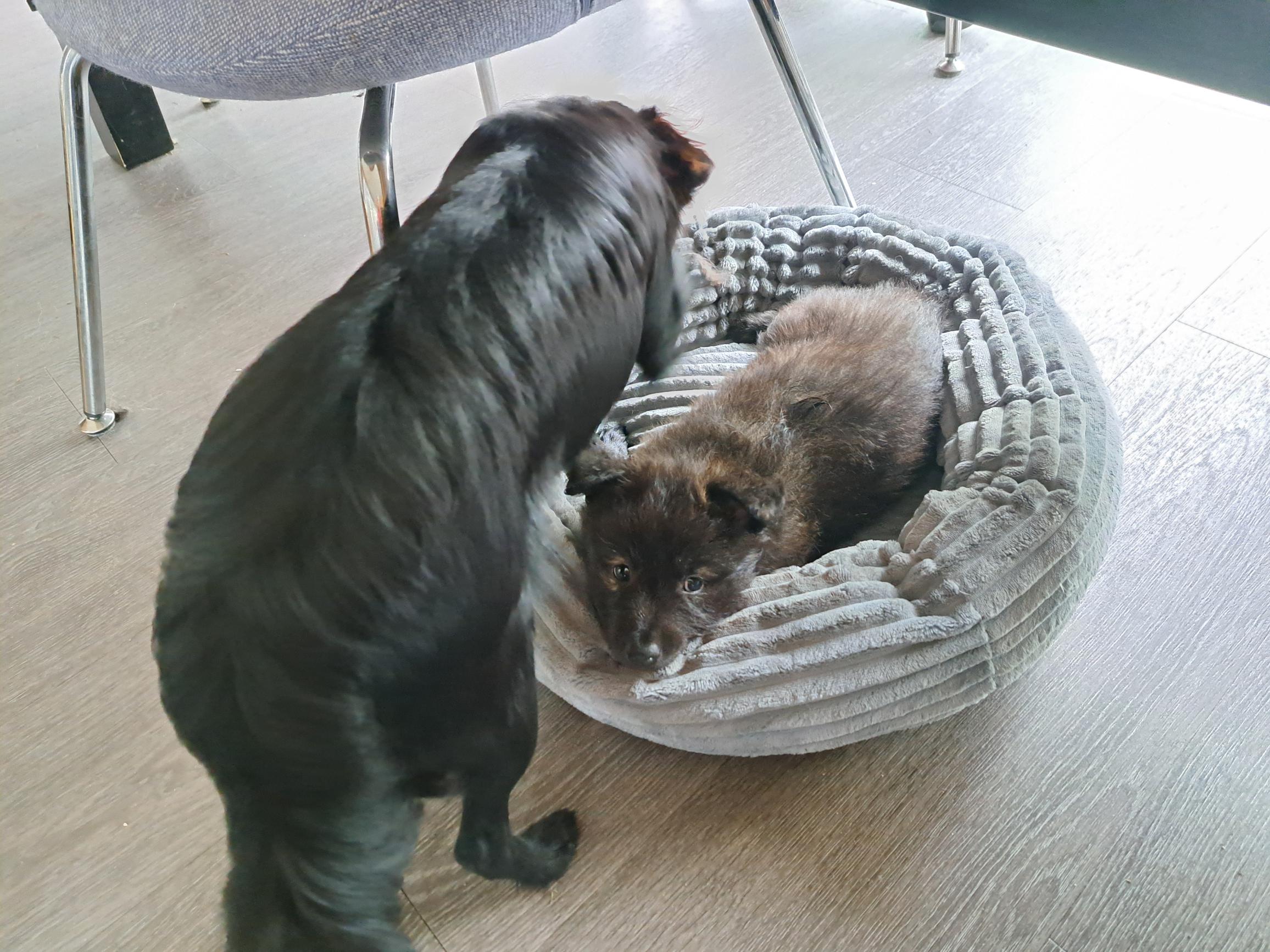De pups zijn al een aantal dagen aan het rond lopen en verkennen eens even wie er nu in hun wereldje zijn komen zitten.