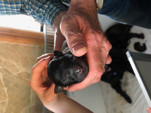 De bevaling was even lastig doordat een pup al eerder in de baarmoederhoorn was afgestorven en daarmee een andere pup had vergiftigd, van de 9 pups op de echo zijn er daardoor gelukig toch nog 7 pups wel gezond ter wereld gekomen. Geluk en pech zitten dicht bij elkaar.
