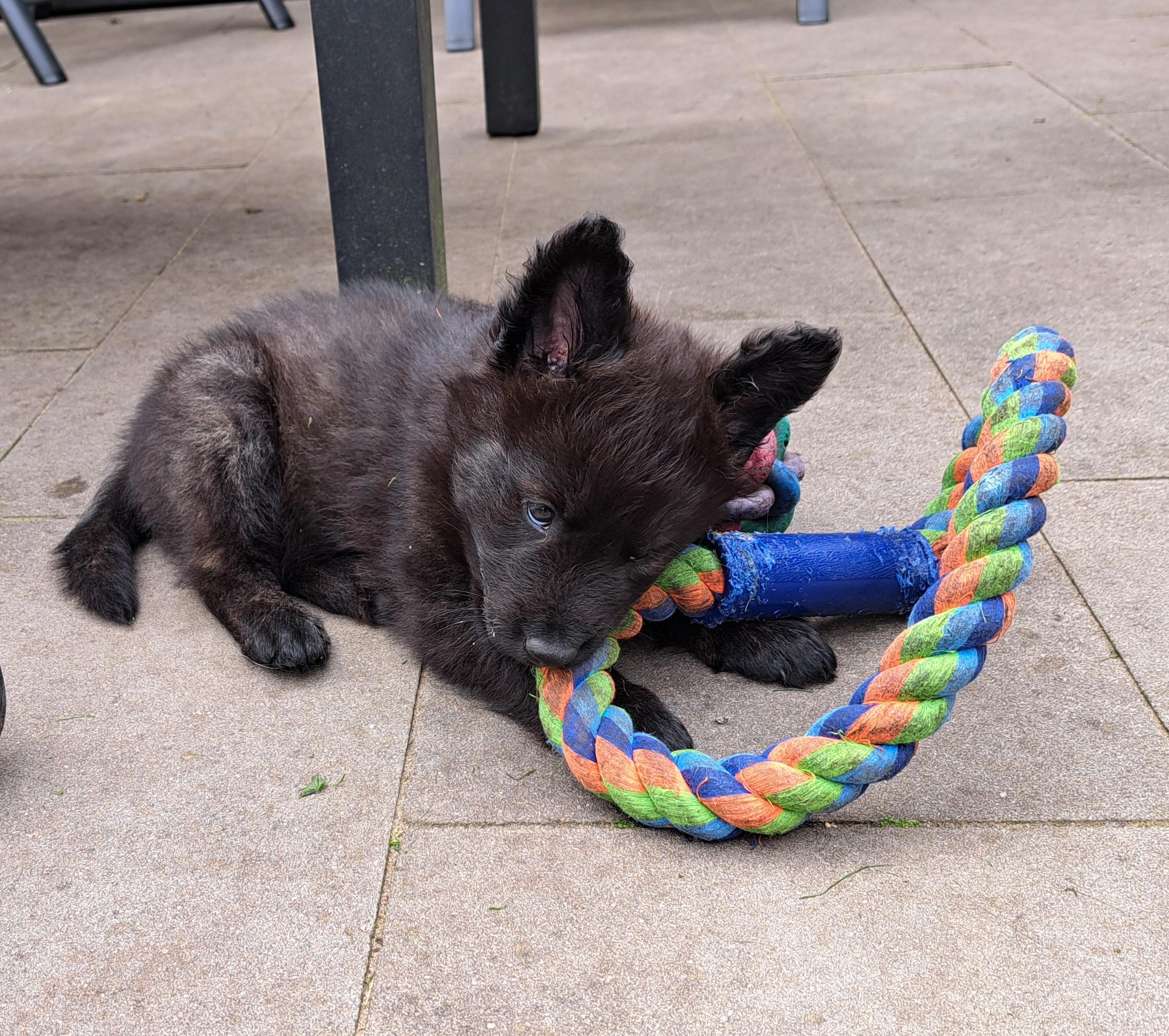 Miro vind de pups wel heel leuk en ook de pups vinden hem een leuk speelmaatje.