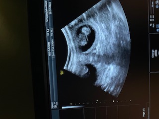 Mooi te zien de blazen met vruchtwater en daarin het embrio van de pup.